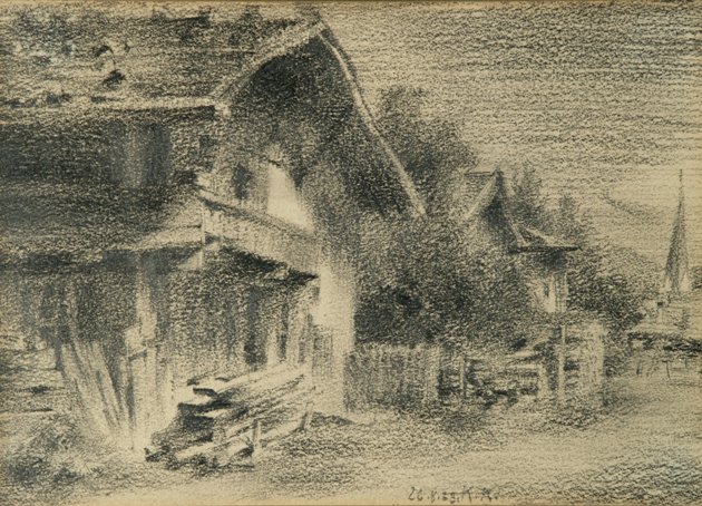 1 Bauernhöfe, sign. 26.8.23 K.K., Bleistiftzeichnung, 17 x 24 cm