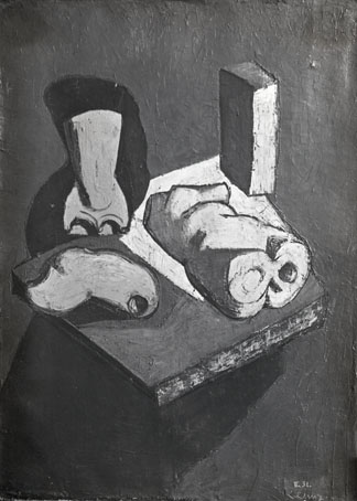 5 Stillleben mit Puppentorsi, Februar 1931, Dekorationsfarbe, Rupfen,