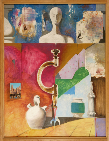 374 Stillleben mit Bohrer, 1962, Öl mit Bleistift und Collage auf Hartfaser,