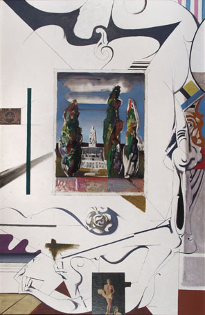 465 Komposition mit Zypressen, Juni 1964, Öl mit Collage (u.a. Ölstudie von Ampurias in Katalanien) auf Hartfaser, 200 x 130,5 cm, sign. 6.64 K.Kunz