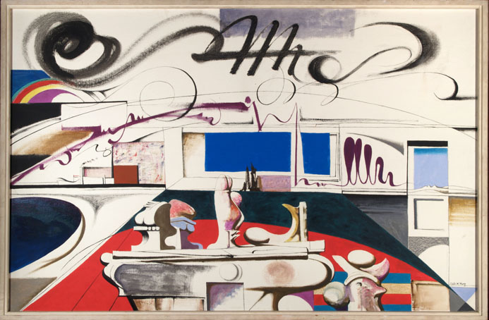 541 Stillleben vor Landschaft, April 1967, Öl auf Hartfaser, 130 x 200 cm,