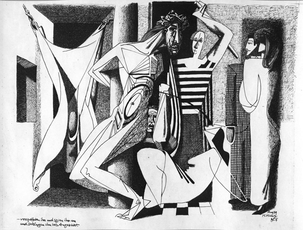 Blatt 4 (Geiselung), ...verspotteten ihn und spien ihn an und schlugen ihm ins Angesicht, sign. Aug.49 K.Kunz