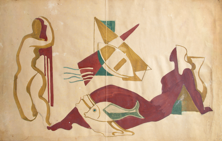 12 Maquette für Wandbild, Sgraffito, im Schwimmbad auf Schloss Halberg, Saarbrücken, 1947, Tempera auf Karton, 42,5 x 69 cm, unsigniert, undatiert