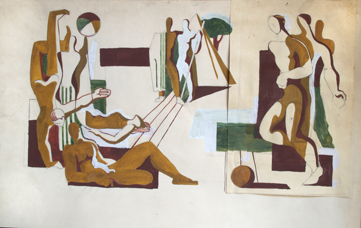 14 Maquette für Wandbild, Sgraffito, im Freizeitraum auf Schloss Halberg, Saarbrücken, 1947, Tempera auf Karton, 37 x 60 cm, unsigniert, undatiert