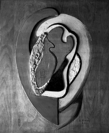 15  Holzrelief, o.T., 1932, Relief aus Sperrholz, Gips, Farbe mit Collage,