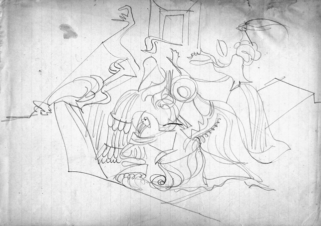 23 Skizze einer skurrilen Szene, 1947-1949, unsign. Bleistift, 20 x 30 cm